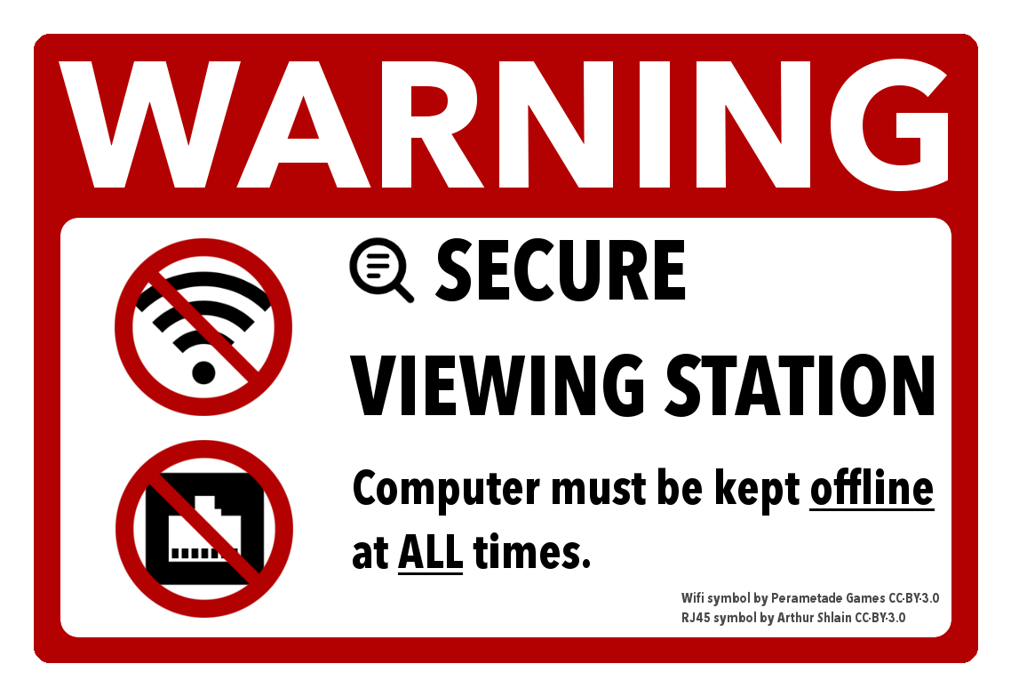 The chosen hardware should be solely used for this purpose. This system must have a removable wireless card, which will need to be completely removed before use. It must also have a removable storage device, such as a solid state drive (SSD) or a hard disk drive (HDD), which likewise needs to be removed prior to using the system. You will only ever boot directly to the Secure Viewing Station USB drive.